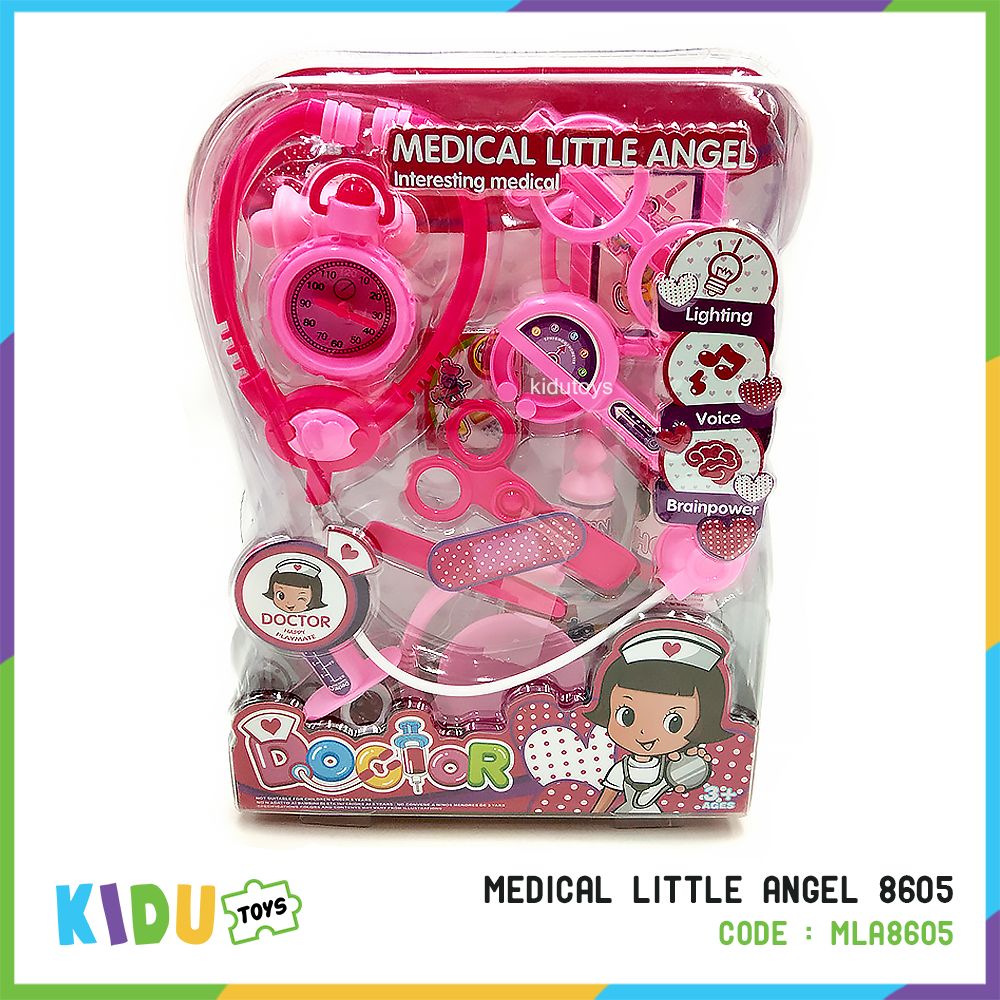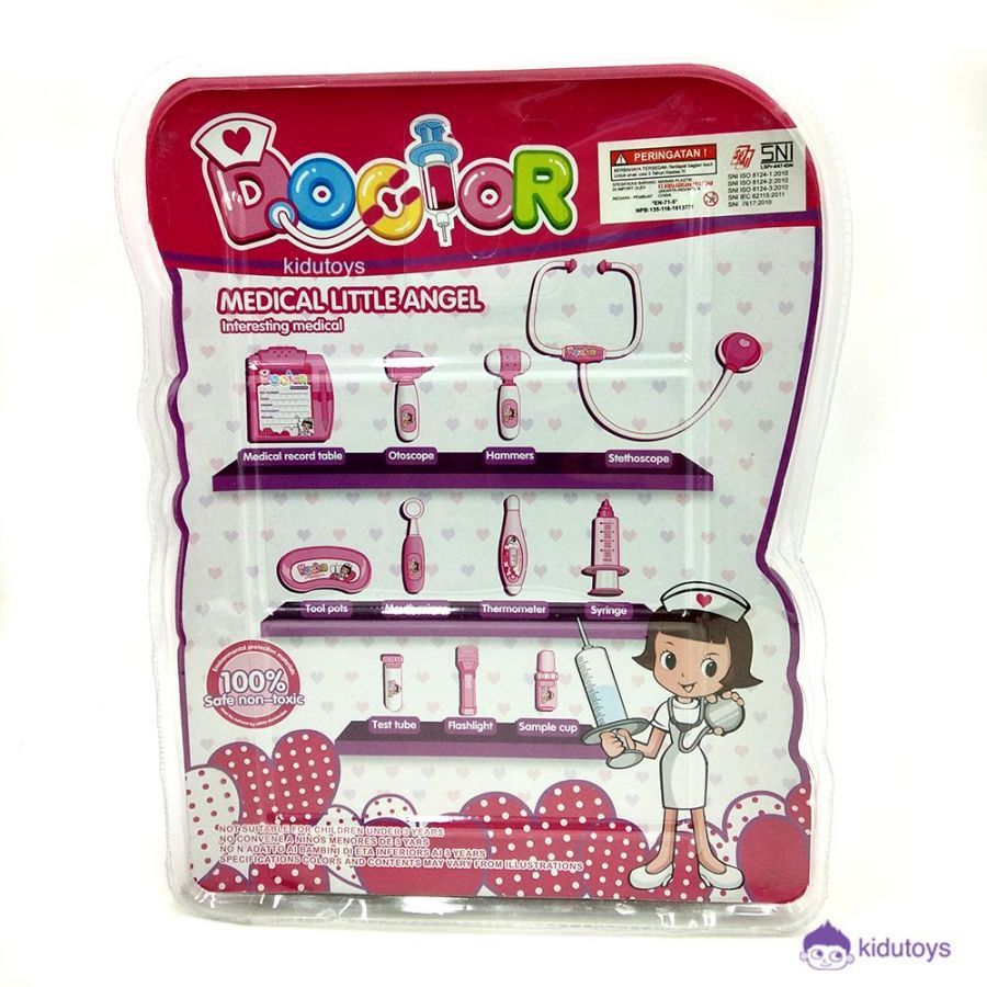 Spesifikasi : Berat 324gr, Ukuran P:30cm L:25cm T:9cm, Usia 3 tahun+, Isi: 11pcs terdapat suntikan, kacamata, pinset, 1 termometer dan 7 alat dokter lainnya.